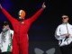 A cast member unfurls a Palestinian flag during a curtain call, prompting a brief scuffle as an official tries to take it away.